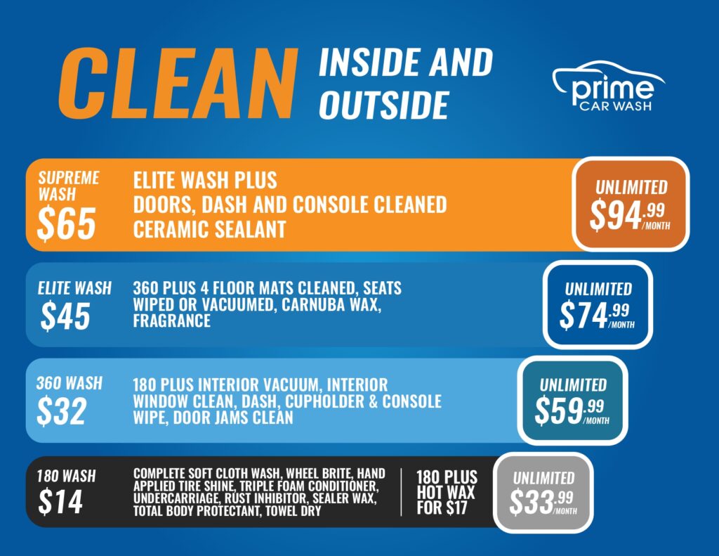 Go Unlimited with Prime monthly unlimited memberships. Wash as often as you would like without limits at an unbeatable value. We offer Unlimited Memberships that fit any budget and cover all your car cleaning needs inside and outside.
